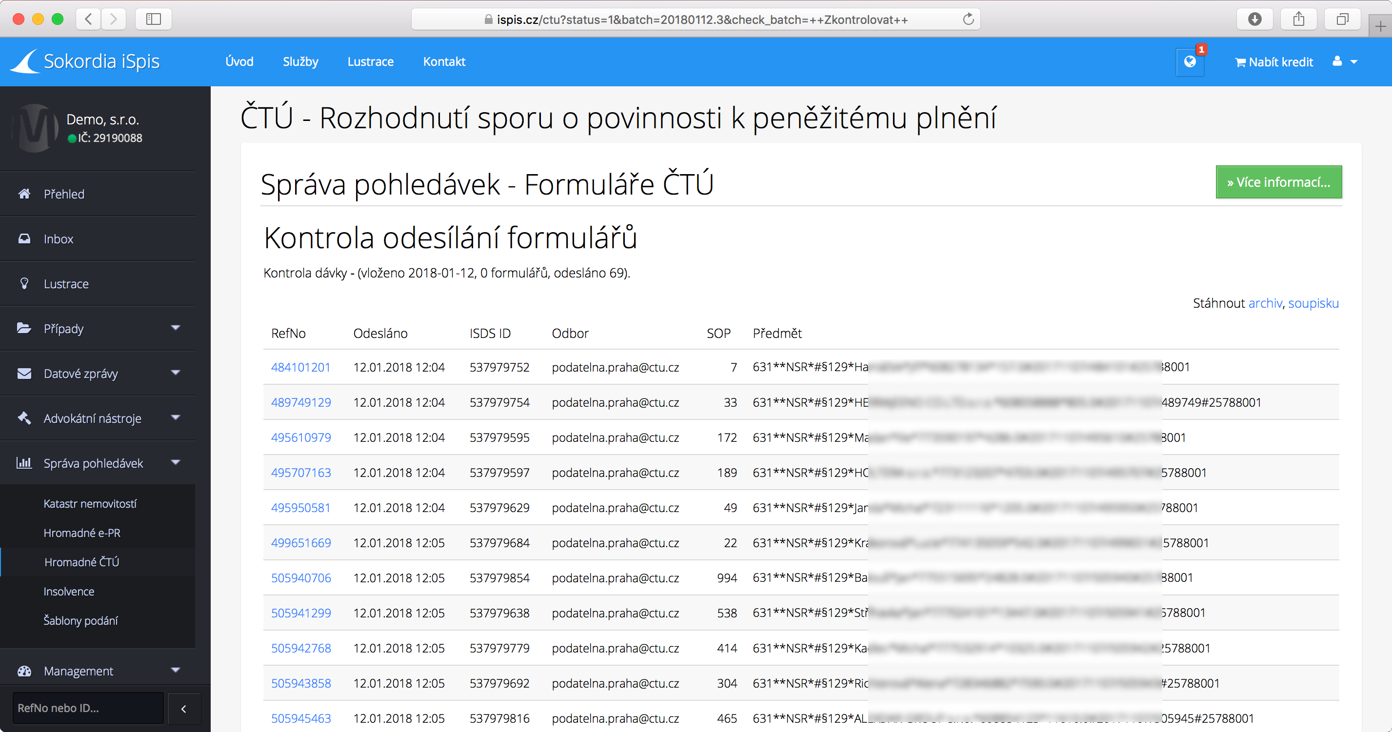 Příklad odeslané dávky podání na ČTÚ.